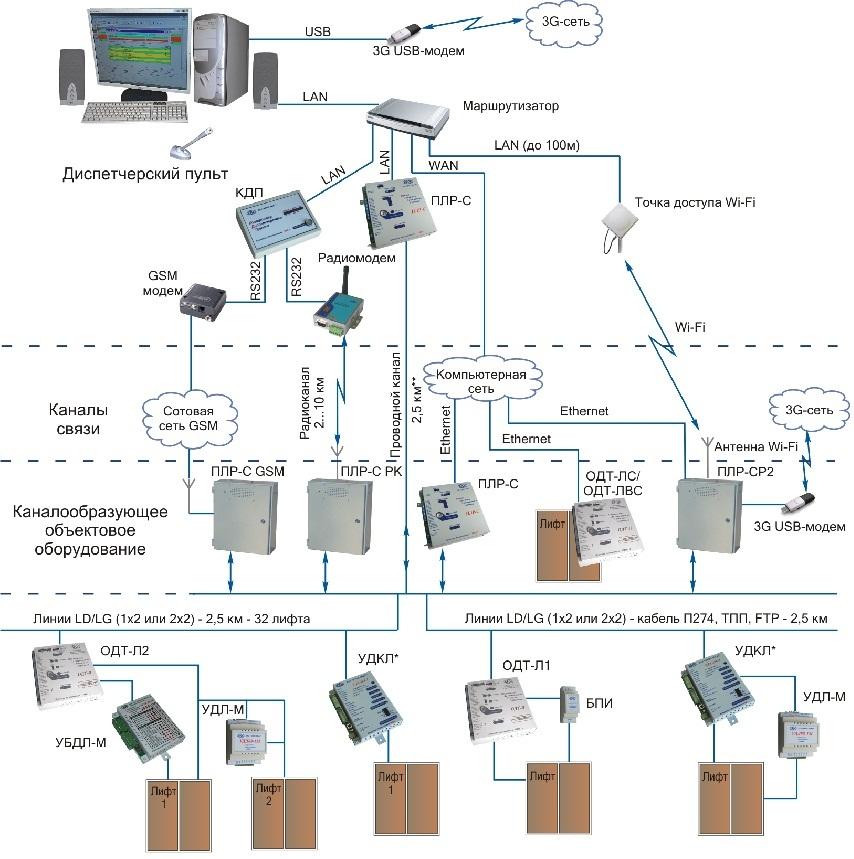 Структура систем диспетчеризации лифтов с различными каналами связи